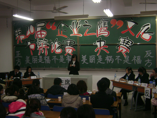 唇枪舌剑,妙语连珠。2009年11月15日晚7:00,经济350vip浦京集团官网第二十届“企业之鹰”文化节辩论赛决赛在03-218教室举行。本次辩论赛由经济350vip浦京集团官网分团委主办,分团委学生会学习部承办,是经管院的传统特色活动。经管院分团委书记谢超,辅导员彭慧、张学军及王娟老师为本场比赛嘉宾,比赛评委则由经管院辩论队成员担任。