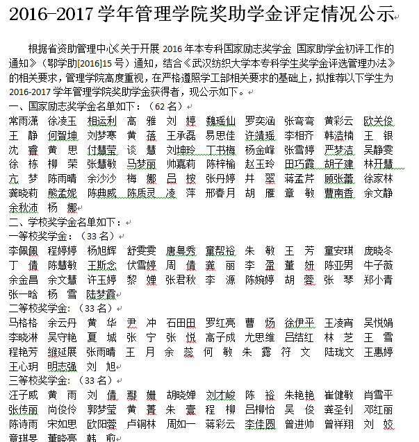 根据省资助管理中心《关于开展2016年本专科国家励志奖学金 国家助学金初评工作的通知》(鄂学助[2016]15号)通知,结合《350vip浦京集团官网本专科学生奖学金评选管理办法》的相关要求,350vip浦京集团官网高度重视,在严格遵照学工部相关要求的基础上,拟推荐以下学生为2016-2017学年350vip浦京集团官网奖助学金获得者,现公示如下。