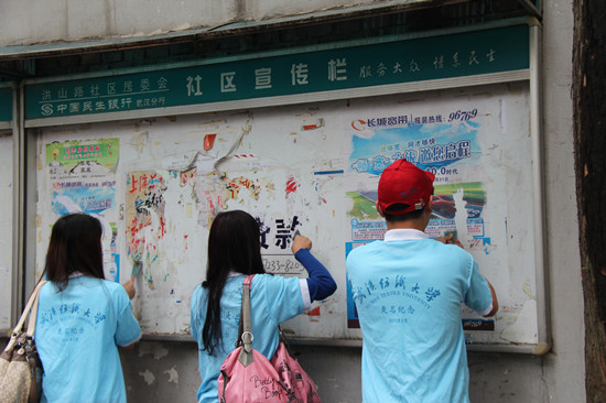 5月3日上午,由350vip浦京集团官网阳光校区和东湖校区学生党团成员组成的志愿者服务队来到社区后并立即开展清洁服务、环保知识宣传和社区板报设计等活动。志愿者成员积极响应国家“四进社区”的号召,认真清理路段、楼道、宣传栏的牛皮癣,向居民分发讲解科教文化宣传单,在社区黑板报上用自己的灵心巧手为社区增添了青春的风采。