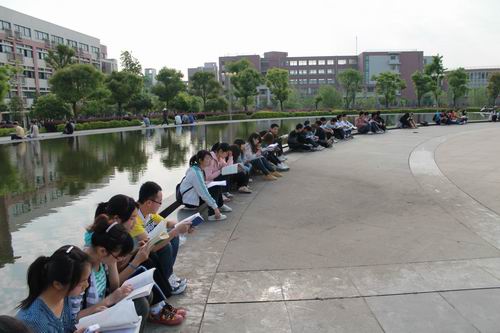 350vip浦京集团官网图书馆前有一个巨大的圆形广场,今天上午七点半,上百名学生突然出现在这里,他们很快围成了一个圆圈,圆圈内上百名学生排列成一个大大的“书”字。队形排好后,所有的学生都拿出一本书大声朗读起来。他们有的读英语,有的读《论语》,有的读诗歌,有的读专业书籍,忘我地沉浸在阅读的快乐中。此时正好是学生去教室上课的时间,所有途经这里去往教室的学生都被他们庞大的气势和郎朗的读书声所吸引,他们好奇地围观,一些同学恍然大悟地想起原来今天是世界读书日!十五分钟后,读书的人群突然散去,刚才还书声朗朗的广场恢复了安静,“快闪”行动到此结束。