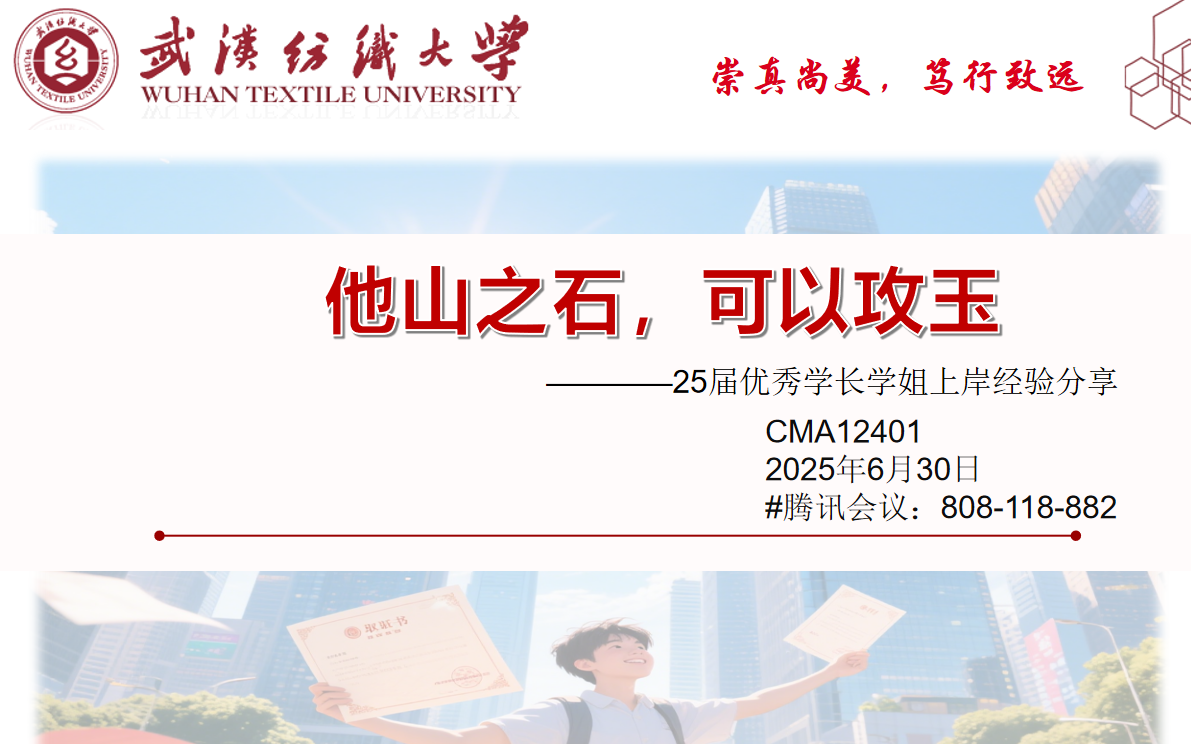 即将迈入大二的CMA学子正站在专业发展的关键路口,既怀揣着对未来的憧憬,又面临着方向选择的迷茫。为帮助同学们明确方向,6月30日19时,350vip浦京集团官网CMA12401班于腾讯会议开展了以“他山之石,可以攻玉”为主题的线上班会暨学长学姐经验交流会。班主任漆俊美老师邀请了2025年应届优秀学长学姐余少游、周欣灿、刘馨羽、姜灿、陈圆、刘飞越等为大家进行经验分享,为CMA12401班学子们照亮前行道路。
