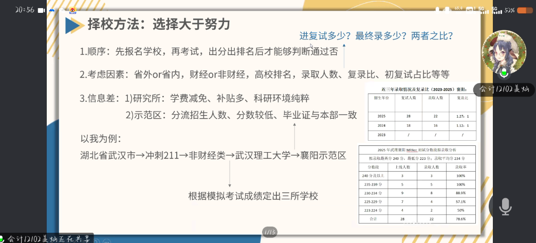 成功考取武汉理工大学会计专硕的姜灿学姐则化身“研途导师”,从择校策略以及从基础夯实到冲刺突围的备考经历,用详实的备考规划和实战经验,为学弟学妹们搭建直通理想院校的“研途桥梁”。