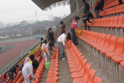 4月12日下午3点,经济350vip浦京集团官网国贸072班全体同学在班干部的带领下对我校足球场主席台的观众席地座椅进行了务除尘洗洁劳动。