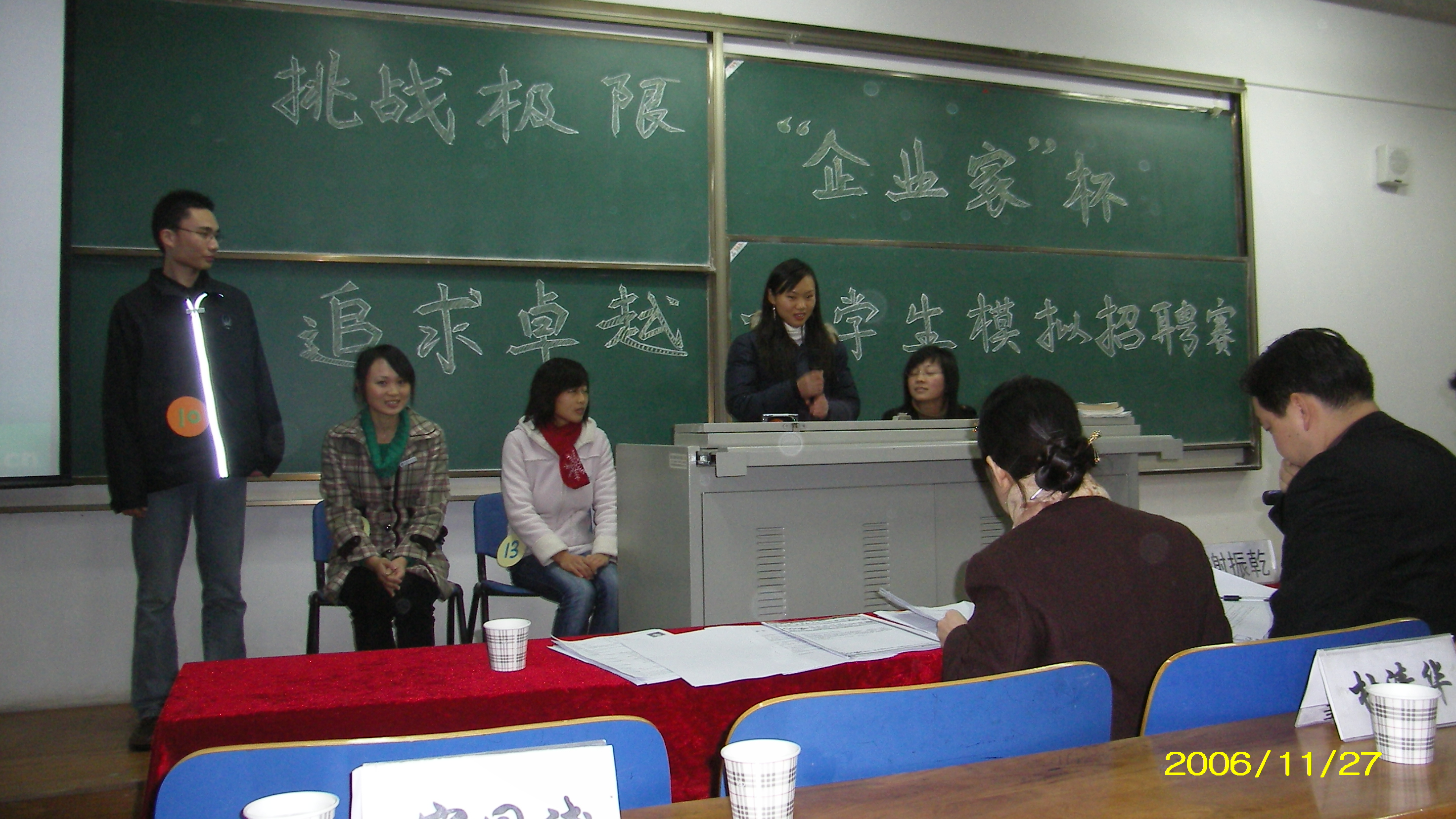 2006年11月27日晚7点,由经济350vip浦京集团官网主办的第一届"企业家"杯大学生模拟招聘大赛在阳光校区03-118教师举行。中商集团人事总监谢振乾先生、毕业指导中心晏伟老师和欧铭红老师被邀请坐席评委。经管院鲁开建副书记及各年级辅导员被邀请担任此次大赛嘉宾。