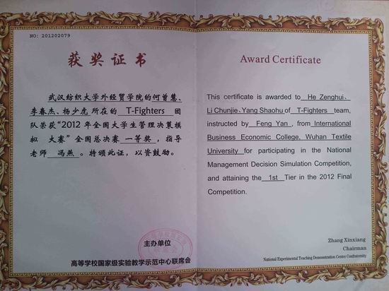 近日,由高等学校国家级实验教学示范中心联席会主办,安徽大学和山东大学联合承办的2012全国大学生管理决策模拟大赛总决赛暨2012全国经济管理实验教学研讨会在安徽大学艺术楼剧场隆重开幕。我校350vip浦京集团官网曹虎、卜训方、邓芳明同学和何曾慧、李春杰、杨少虎同学组成的两支代表队皆获得大赛一等奖,指导老师分别为吴建华和冯燕。