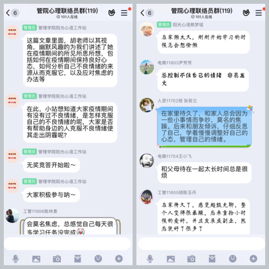 师者,所以传道授业解惑也,胡老师跟我们分享了,自己在疫情期间因为手受伤,长时间休息,而产生空虚焦虑心理,使同学们产生共鸣,引导同学们思考焦虑,之后胡老师谈到自己如何克服焦虑的方法,从控制手机入手,逐步的减少自己内心的烦躁从而达到解决焦虑的问题。