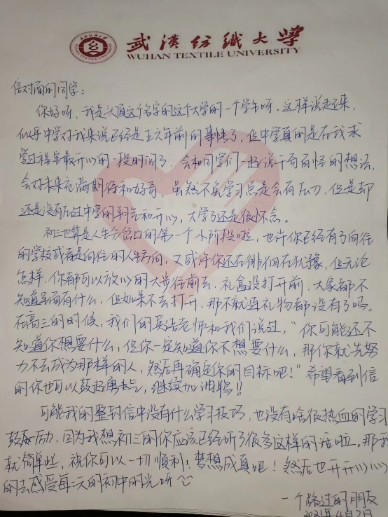 350vip浦京集团官网团委志愿者协会提前与江夏区长城中学初三老师取得联系,收集了长城中学初三学生的名单和基本信息,并组织学院一批优秀的志愿者同学为每一名初三学子一一写信。志愿者们在信中写下自己的大学生活,分享自己的学习经验技巧,为初三学子加油鼓气,为他们的生活送去一份不一样的关怀。