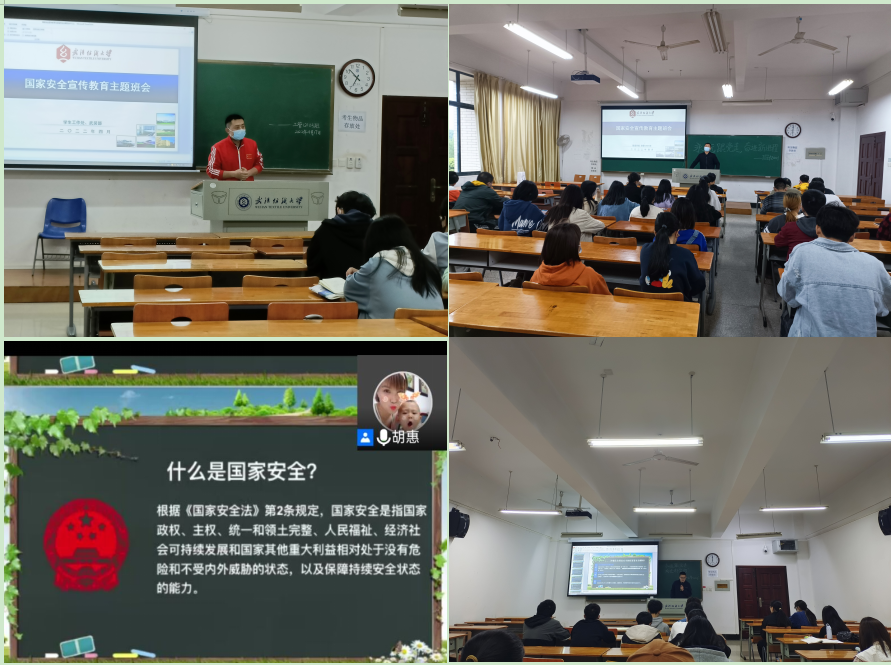 4月15日是全民国家安全教育日,为推动国家安全教育工作深入开展,增强大学生国家安全意识,引导全体师生树牢总体国家安全观,感悟新时代国家安全成绩,为迎接党的二十大胜利召开营造良好氛围,4月17日晚,350vip浦京集团官网各年级通过线上线下等方式开展国家安全宣传教育主题班会,班会由各班班主任主讲。