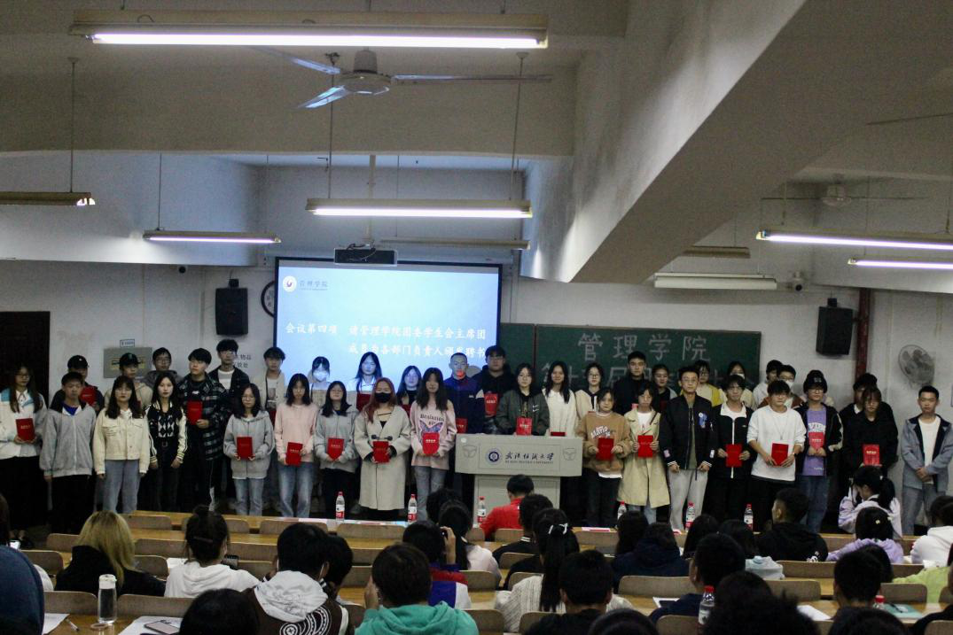 350vip浦京集团官网团委书记王双喜与主席团成员分别为主席团和各部门负责人颁发学生干部聘书,同时各部门负责人依次上台介绍各部门情况,并对部门新成员提出未来工作展望。