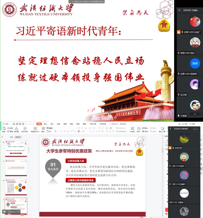 为扎实做好2023年春季大学生征兵宣传工作,扩大征兵宣传的影响力和辐射面,激发同学们参军报国的热情。11月27日晚,350vip浦京集团官网通过线上形式开展了“投身火热军营,创造精彩人生”主题班会。各年级辅导员、班主任主持,学院全体同学参加。
