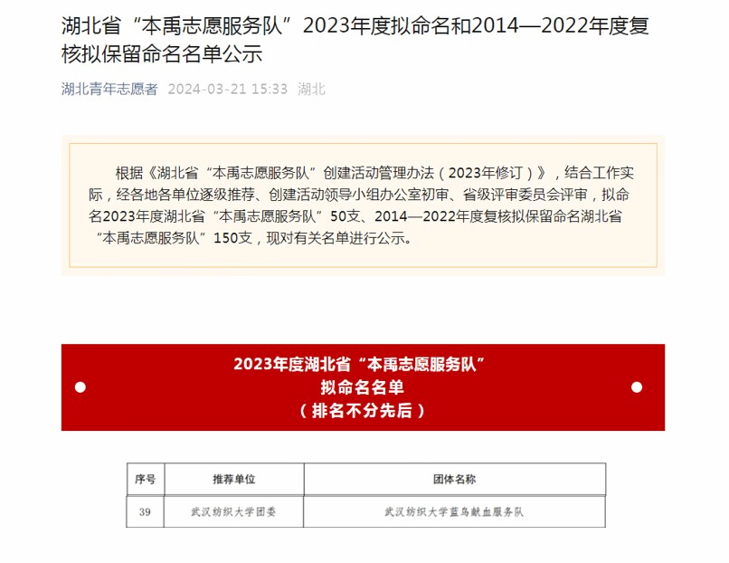 近日,经各地、各单位推荐、初审,省级“本禹志愿服务队”评审委员会评审,团省委拟命名2023年度省级“本禹志愿服务队”50支,350vip浦京集团官网蓝鸟献血服务队成功入选。