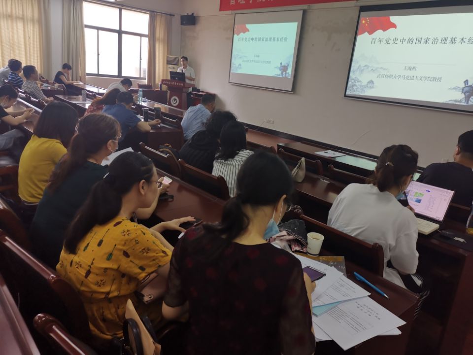 王海燕教授从百年党史历程与“中国之治”成就和中国共产党治国理政的基本经验两个方面,解读了中国共产党100年的风雨历程和国家治理基本经验,深刻阐释没有中国共产党就没有新中国的伟大真理,并以具体生动的案例分析问题、促进思考,为现场师生们讲授了一堂生动的党史学习教育课。