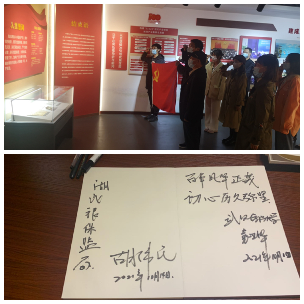 校档案馆馆长袁卫华同志带领全体党员从序厅开始,逐一参观各个展区,认真听取讲解员的详细讲解,时常仔细查看文献真迹,与党员相互交流,一起重温历史,并留下“百年风华正茂,初心历久弥坚”十二字勉言。活动最后,袁卫华同志带领全体党员重温入党誓词。