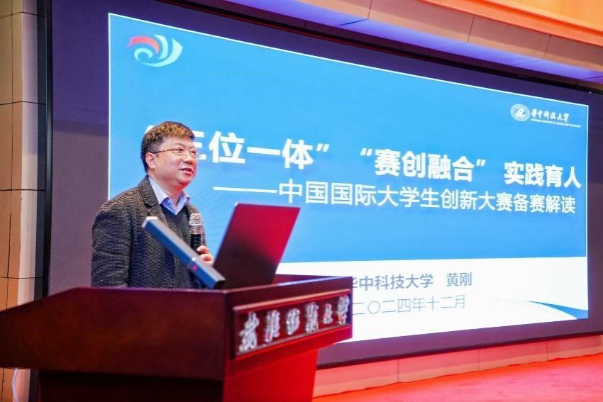 华中科技大学启明学院黄刚教授向大家介绍了中国国际大学生创新大赛备赛,并对其进行了深入解读。他强调,大赛不仅是学生展示创新才能的平台,更是培养拔尖创新人才的重要途径。华中科技大学通过构建创新创业教育共同体,推进教育、科技、人才“三位一体”,为国家现代化建设培养了大量优秀人才。