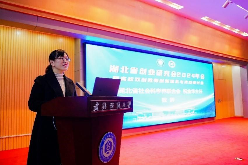 随后,湖北省社会科学界联合会祝金华主任对本次研讨会的顺利召开表达了诚挚的祝贺,并高度赞扬了湖北省创业研究会在过去一年中不懈的努力与取得的显著成就。她表示,湖北省社会科学界联合会将进一步充分发挥桥梁纽带作用,引领各高校研究会举办创新创业活动,搭建创新创业平台,提升学生创新创业能力,共同书写创新创业新篇章。