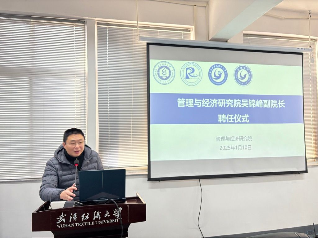 1月10日上午,管理与经济研究院在南湖校区西配楼三楼会议室隆重举行副院长吴锦峰教授的聘任仪式。党委常委、副校长冯军出席仪式并讲话,350vip浦京集团官网党委书记赵立彬、执行院长吴金红、管理与经济研究院院长夏火松及学院班子、各系主任、教师代表参加仪式,仪式由夏火松主持。