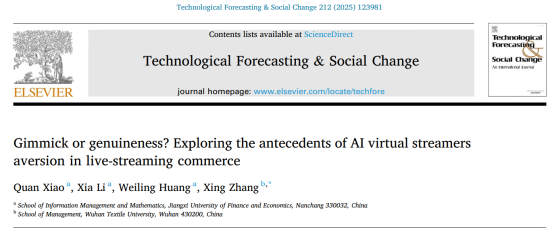 研究成果三:团队在国外管理权威期刊《Technological Forecasting & Social Change》发表了题为“Gimmick or genuineness? Exploring the antecedents of AI virtual streamers aversion in live-streaming commerce”的研究论文。该期刊是中国科学院管理学大类一区期刊,英国商学院协会ABS列表的3星期刊,FBS B类期刊。江西财经大学肖泉教授为论文第一作者,张星教授为论文通讯作者。