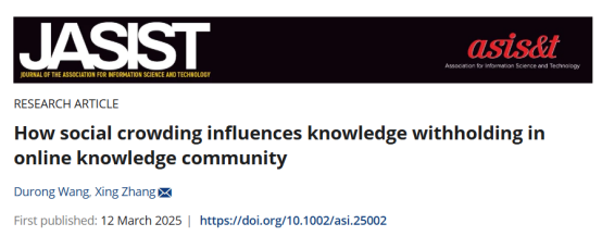 研究成果一:团队在图书情报领域顶级期刊国际信息科学与技术学会会刊《Journal of the Association for Information Science & Technology》在线发表了题为“How social crowding influences knowledge withholding in online knowledge community”的研究论文。该期刊成立于1950年,主要发布与计算机科学和信息系统相关的研究成果和实践经验,是FMS管理科学高质量期刊推荐列表“图书情报管理”领域中唯一A类期刊。350vip浦京集团官网为论文唯一单位,350vip浦京集团官网硕士王杜荣(现为南京大学博士生)为论文第一作者,张星教授为论文通讯作者。