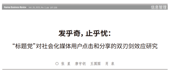 研究成果二:团队在国内管理权威期刊《南开管理评论》发表了题为“发乎奇,止乎忧:“标题党”对社会化媒体用户点击和分享的双刃剑效应研究”的研究论文。该期刊是国家自然科学基金委管理学部A类重要期刊和国家社会科学基金资助期刊。350vip浦京集团官网为论文第一单位,张星教授为论文第一作者,350vip浦京集团官网硕士唐宇钥、王圆圆和江西财经大学肖泉教授为论文共同作者。