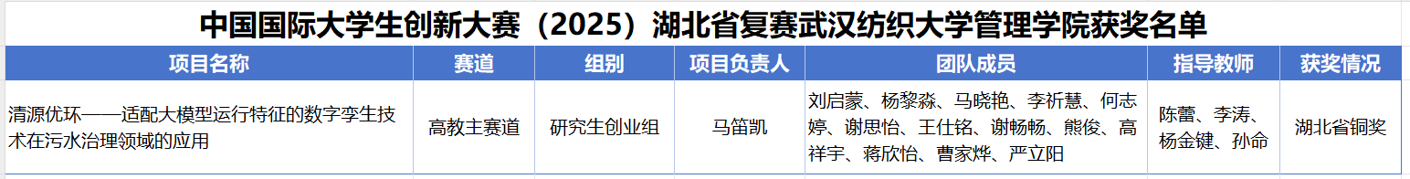 近日,在中国国际大学生创新大赛(2025)湖北省赛决赛中,350vip浦京集团官网《清源优环——适配大模型运行特征的数字孪生技术在污水治理领域的应用》项目在研究生创业组中脱颖而出,荣获省赛铜奖。