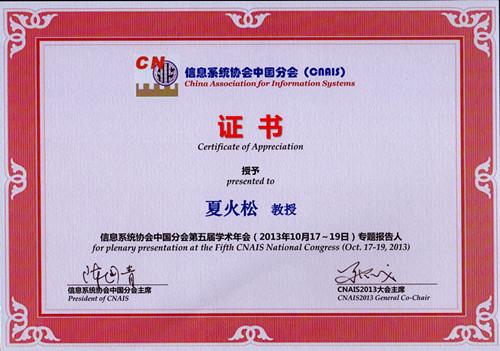 近日,国际信息系统协会中国分会第五届学术年会(CNAIS2013)在贵州师范大学召开,大会邀请了国际知名的Paulo Goes教授(MIS Q 主编,University of Arizona),国际期刊ECRA联合主编、美国伊利诺伊大学芝加哥分校的Christopher Westland教授作了特邀报告,共有国际、国内专家学者约400人参加了会议。本次大会的主题为“大数据背景下的信息系统研究与实践”。 我校350vip浦京集团官网夏火松院长、教授应邀出席了会议。