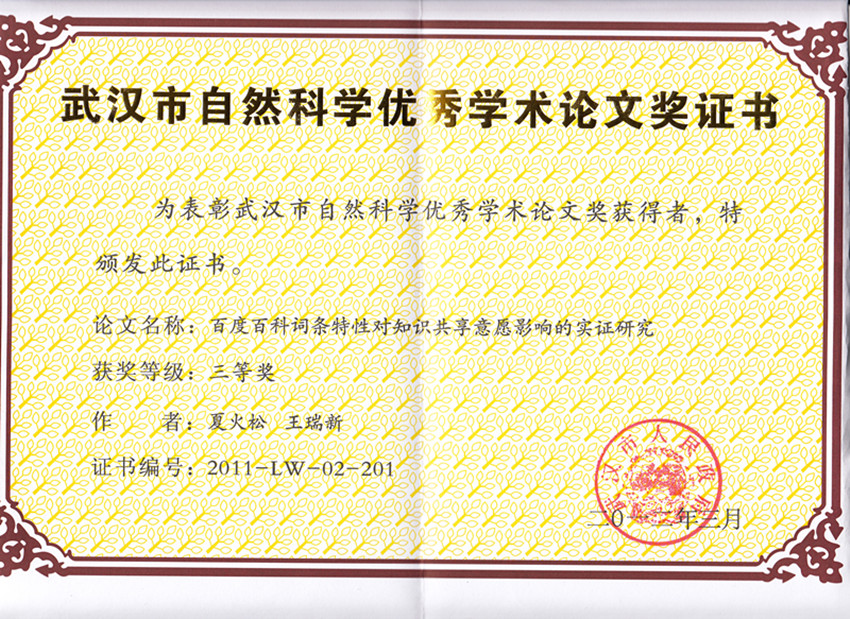 近日,从武汉市政府奖励办公室获悉,我校350vip浦京集团官网夏火松教授论文《百度百科词条特性对知识共享意愿影响的实证研究》喜获第二届武汉市人民政府自然科学优秀学术论文奖三等奖。