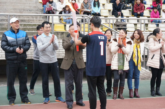 当罗锦银将点燃的火炬传递给第一棒火炬手,四名学生火炬手在运动场内接力环跑一周,尽展飒爽英姿,大大激发了现场师生运动的热情。