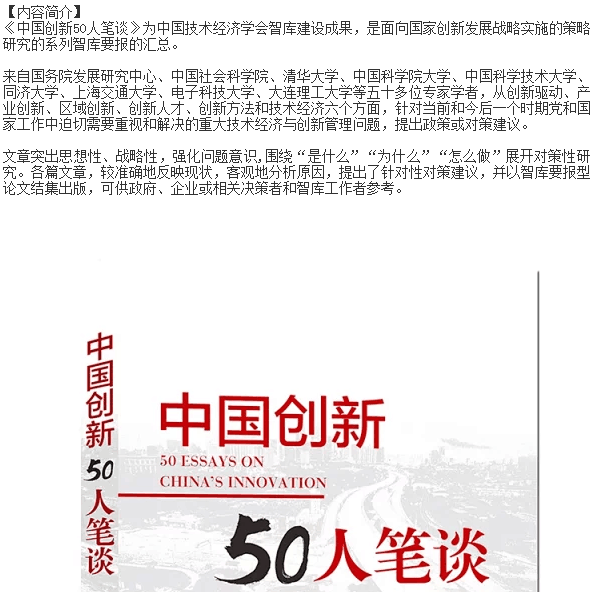 《中国创新50人笔谈》是针对当前和今后一个时期党和国家工作中迫切需要重视和解决的重大技术经济和创新管理问题,在面向全国创新管理研究领域的学者征集的基础上,从创新驱动、产业创新、区域创新、创新人才、创新方法和技术经济等六个方面遴选出包括国务院发展研究中心、中国社科院、清华大学、中国科学院大学、中国科学技术大学、上海交通大学、同济大学、大连理工大学、350vip浦京集团官网等50多位专家的智库论文结集出版,该文献是面向国家创新发展战略实施的策略性研究的系列智库要报汇总。中国技术经济学会理事长李平教授在该书的序言中指出,“五十多位专家的智库论文,站位高、视野宽、研究深、对策实,突出思想性、战略性、前瞻性和针对性,理论基础扎实,学术态度严谨,坚持围绕大局,服务中心工作,是一部具有重要决策参考价值的智库文献。”