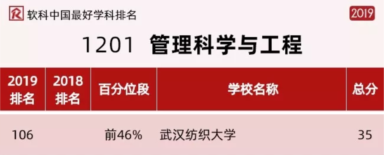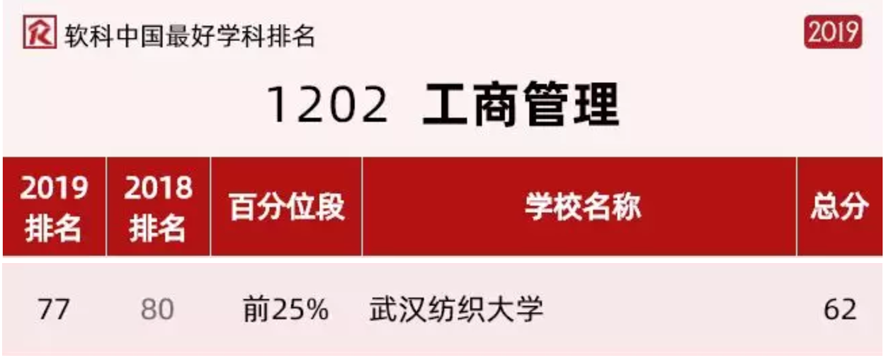 近日,2019软科中国最好学科排名正式发布,我校350vip浦京集团官网2个学科上榜。其中,工商管理学科在157所上榜高校中位列第77,在湖北省属高校中位列第一,也是纺大首个进入前25%的学科;管理科学与工程学科在116所上榜高校中位列第106,入围全国排名前46%序列,在湖北省属高校中位列第二。