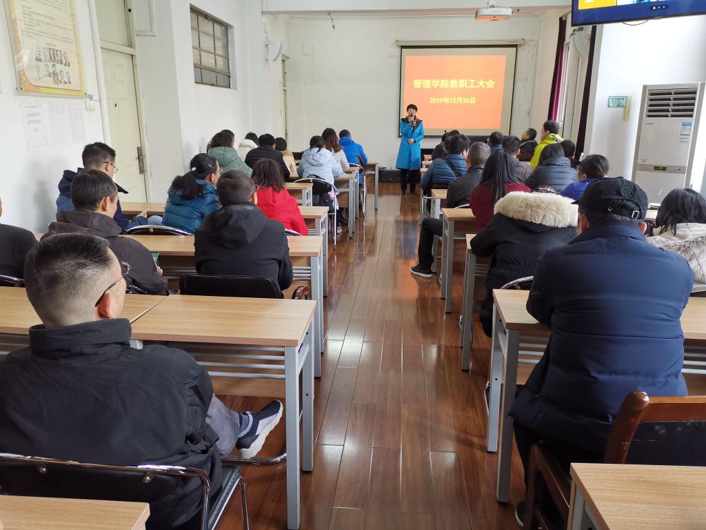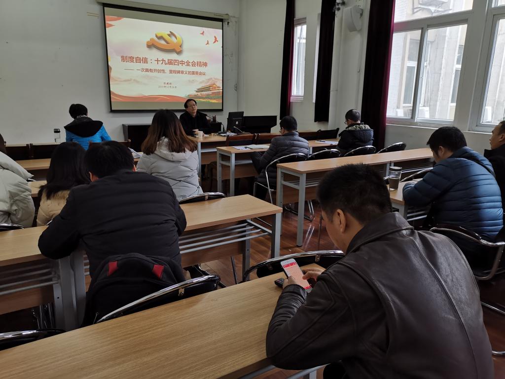 按照学校党委统一部署,12月26日下午,学习贯彻党的十九届四中全会精神学校党委宣讲团成员、马克思主义学院张建林教授,为350vip浦京集团官网全院教职工作了一场专题宣讲报告。350vip浦京集团官网党委书记滕胜娟主持宣讲报告会。
