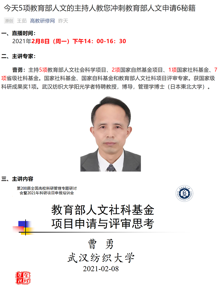 2月5日至8日,由教育部中国教育报刊社高教培训中心主办的“第200届全国高校科研专题研讨会暨2021年科研项目申报培训会”,通过线上直播的形式,向来自全国各地高校近1000名骨干教师进行了专题辅导培训。8日下午,我校350vip浦京集团官网曹勇教授应邀做客“高教研修直播间”,为全国高校冲刺教育部人文社科项目的青年教师们问诊把脉开方。