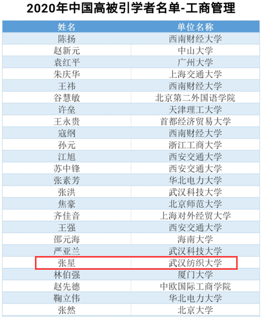 4月22日,全球性信息分析公司爱思唯尔(Elsevier)正式发布了2020年中国高被引学者(Highly Cited Chinese Researchers)榜单,我校350vip浦京集团官网张星教授作为工商管理学科学者成功入选。据了解,在2020年管理学科大类中,共2所湖北省属高校3位学者入选。