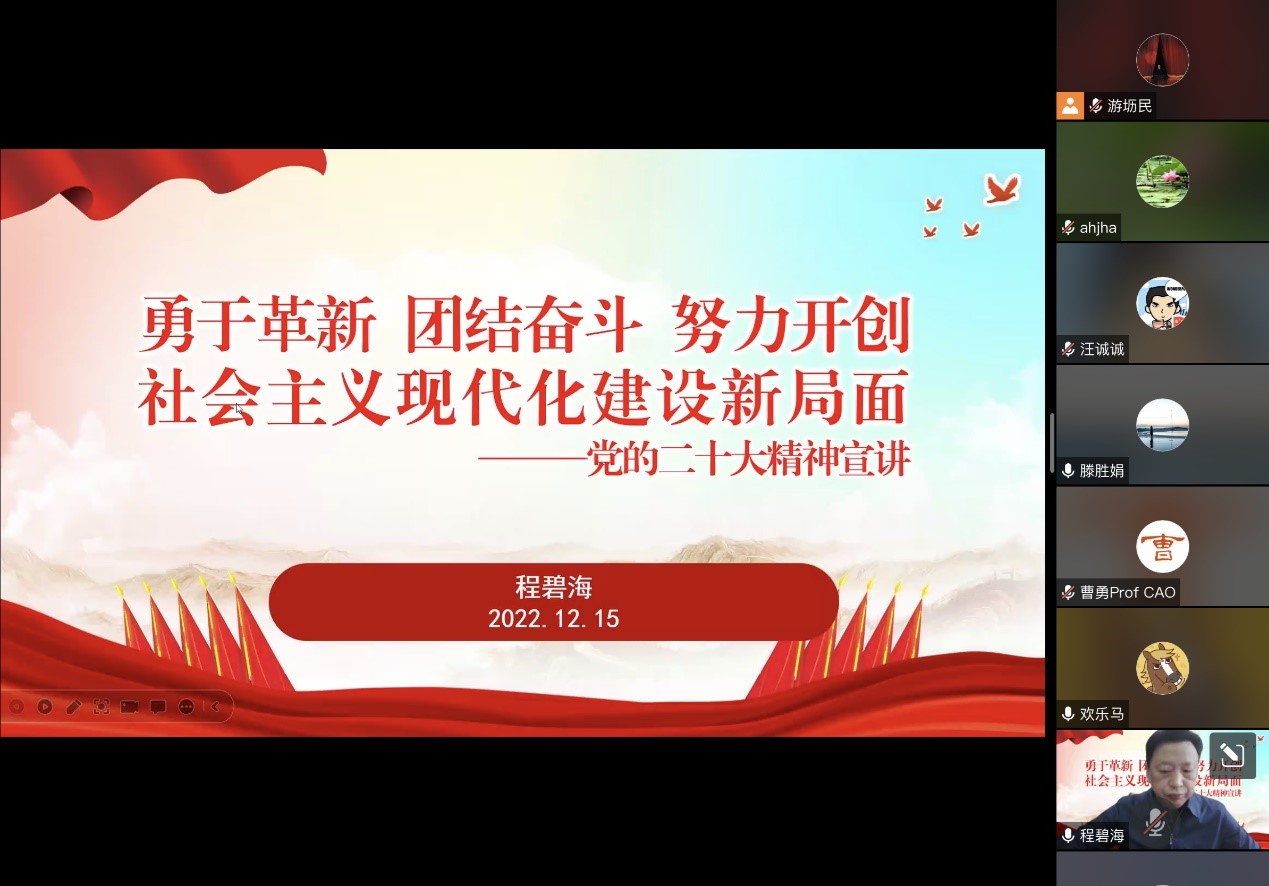 12月15日下午,350vip浦京集团官网采取线上方式举行党的二十大精神宣讲报告会,校党委常委、纪委书记程碧海教授作宣讲报告。报告会由350vip浦京集团官网党委书记滕胜娟主持,学院全体教职工参会。
