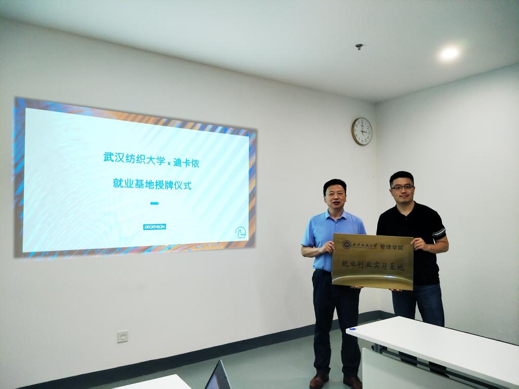 随后,程碧海详细介绍了学校的办学历程、专业设置、人才培养、科学研究、学生特点以及学校近年来发展等情况。程碧海表示,通过此次交流,对迪卡侬企业的产品、企业价值观等方面有了更加深刻的认识和了解。要以本次访企拓岗专项行动为契机,深化学校与迪卡侬的校企合作,充分利用学校在纺织、管理领域的专业与学科优势,进一步探讨校企合作新模式。最后,程碧海为“就业创业实习基地”揭牌,对王晓初等校友心系母校发展深表感谢,程碧海要求学院在毕业生就业、学生实习及校园招聘等方面,积极与校友做好对接,拓展长期稳定的就业合作渠道,为毕业生创造更多实习和就业机会,不断提升人才培养质量,持续推动培养适合国家、社会以及行业的复合型人才。