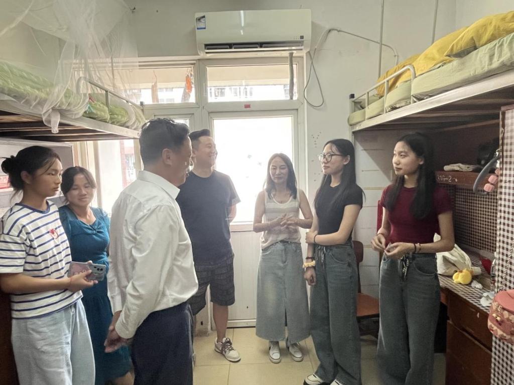 “同学你来自哪里?”“第一天来到学校,感觉怎么样?”“住宿是否习惯,食堂饭菜是否可口?”,滕胜娟、吴金红亲切询问新生们的到校情况和入学感受,鼓励大家尽快适应大学的学习和生活节奏,找到人生目标和未来方向,学有所得、学有所成。