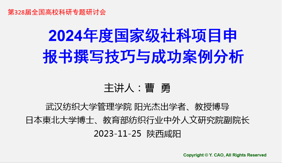 12月25日,曹勇教授应邀赴陕西咸阳师范学院,为该校经管学院、教育科学学院、马克思学院、文学与传播学院、历史文化学院、美术学院、外国语学院等人文社科类学院骨干教师以及科研平台基地负责人做了“2024年度国家级社科类项目申报书撰写技巧及成功案例分析”的大会辅导报告。他从“站位要高、立意要深”的视角,重点围绕国家级社科项目的选题、点题、破题、立题、解题和结题等六大环节,结合大量成功立项申报书案例做了深度讲解与经验分享,并针对不同学科、不同研究方向的参会教师在学科交叉选题、科研团队建设、国家级科研项目培育等方面的需求进行了一对一现场辅导,提出“强意识、练内功、积人脉、换思维、借外力”的策略建议,得到参会者的高度评价。