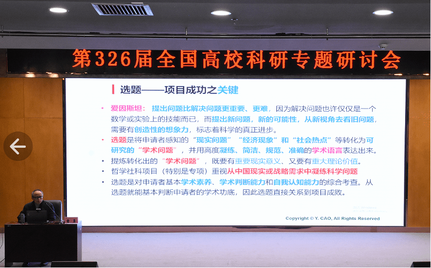 应教育部高校研修中心邀请,12月2-4日350vip浦京集团官网阳光杰出学者曹勇教授赴长春财经学院出席“第326届全国高校科研专题研讨会”,受邀为主讲嘉宾做了“2024年度教育部人文社科基金项目选题技巧与申报书质量提升策略”的学术讲座。