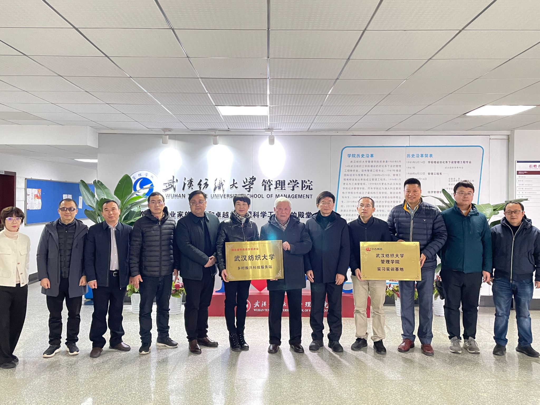 学院和湖北省科技进步促进会和京古集团就“乡村振兴科技服务站”和“实习实训基地”进行授牌并合影留恋。
