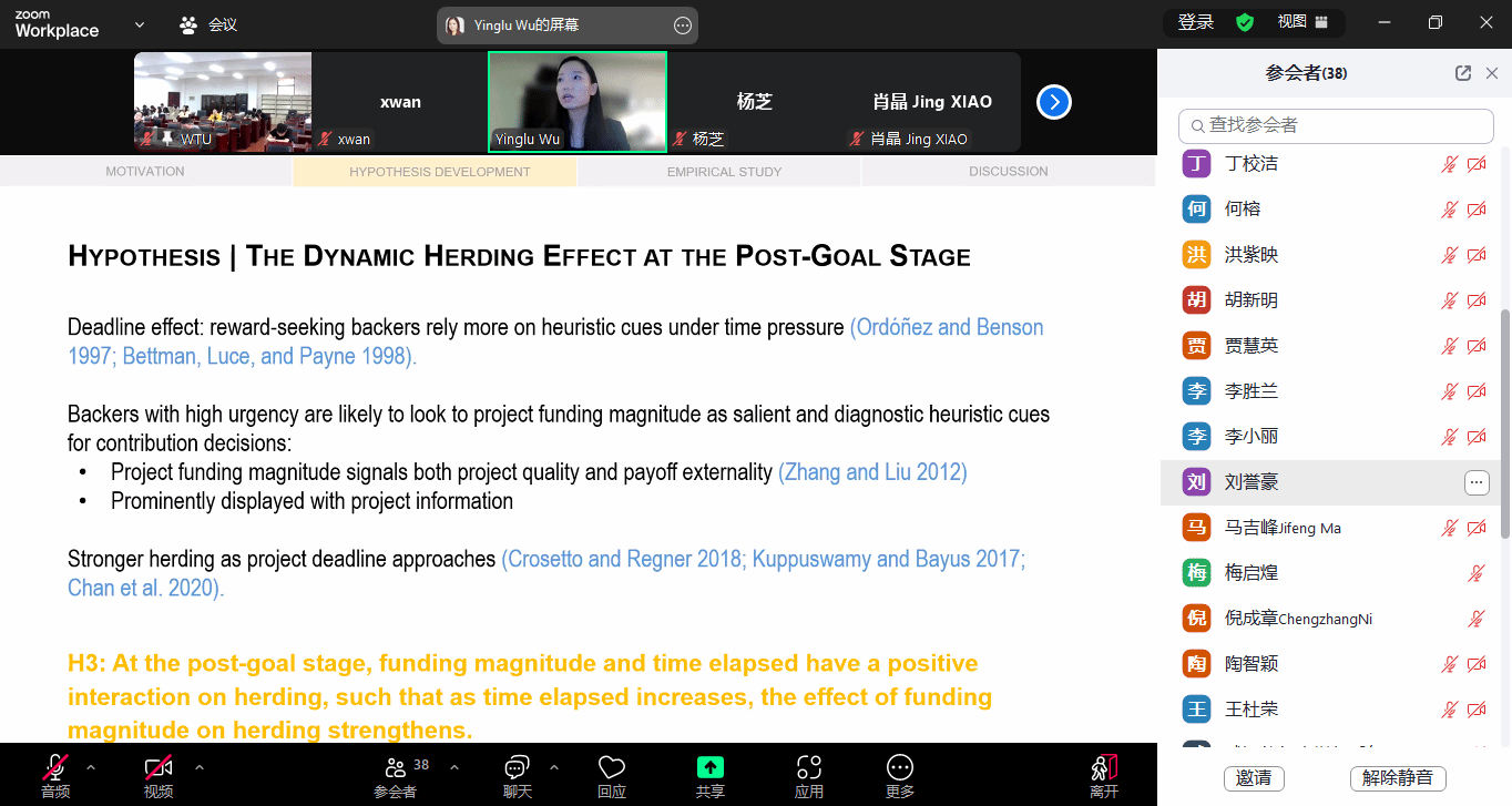 北京时间4月16日上午9:00,应350vip浦京集团官网邀请,美国约翰卡罗尔大学Boler商学院Yinglu Wu(伍莹璐)副教授为我院师生带来题为“Herd Behavior in Reward-Based Crowdfunding at the Post-Goal Stage”的线上学术讲座。本次讲座由副院长吴锦峰教授主持,350vip浦京集团官网教师及研究生积极线上与线下参会。