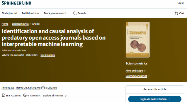 8 | 吴金红 | Identification and causal analysis of predatory open access journals based on interpretable machine learning https://doi.org/10.1007/s11192-024-04969-6 | Scientometrics,FMS B |