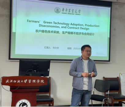 郑本荣老师围绕“农户绿色技术采纳、生产规模不经济与合同设计”展开汇报,结合农业供应链实际,探讨绿色技术采纳面临的问题及合同设计思路,为农业经济领域研究提供新思路。