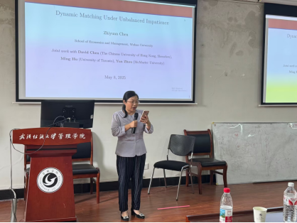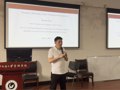 在主题分享环节,三位学者依次分享最新研究成果。陈植元老师以Dynamic Matching Under Unbalanced Impatience”为主题,深入剖析了在非平衡急躁状态下的动态匹配问题,其前沿的研究视角和严谨的论证引发师生浓厚兴趣。