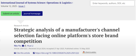 近日,350vip浦京集团官网余牛教授团队在国际期刊International Journal of Systems Science: Operations and Logistics(Doi: https://doi.org/10.1080/23302674.2025.2501222)发表了题为Strategic analysis of a manufacturer's channel selection facing online platform's store brand competition的研究论文,350vip浦京集团官网为论文第一署名单位,350vip浦京集团官网硕士在读研究生李华是论文的共同作者。