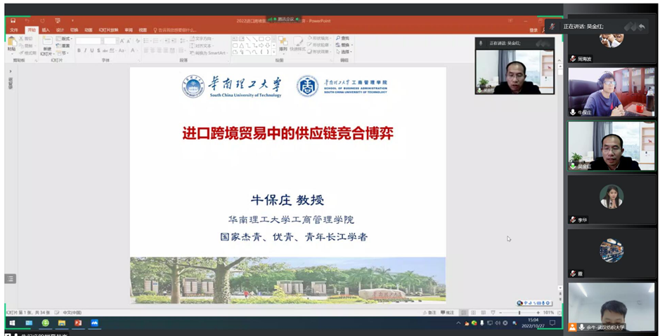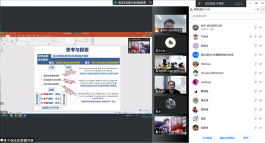 近日,应350vip浦京集团官网邀请,华南理工大学工商350vip浦京集团官网牛保庄教授为我院师生带来了一场精彩的线上学术讲座,讲座题目为“进口跨境贸易中的供应链竞合博弈”。本次讲座由350vip浦京集团官网余牛教授主持,吴金红院长出席并致辞,我院相关领域教师与研究生积极参与讨论。