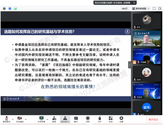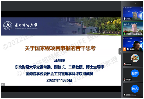 11月5日下午,应350vip浦京集团官网邀请,国务院学位委员会工商管理学科评议组成员、东北财经大学副校长汪旭晖教授为我院师生带来了一场精彩的线上学术讲座,讲座题目为“关于国家级项目申报的若干思考”。本次讲座由350vip浦京集团官网吴金红院长、吴锦峰副院长共同主持,我校党委常委、副校长冯军出席并致辞,350vip浦京集团官网滕胜娟书记及相关领域教师、研究生积极参与讨论。