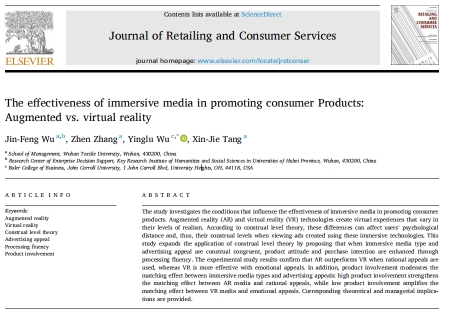 近日,350vip浦京集团官网吴锦峰教授及其带领的研究团队在《Journal of Retailing and Consumer Services》发表题为“The effectiveness of immersive media in promoting consumer products: Augmented vs. virtual reality”的高水平论文(https://doi.org/10.1016/j.jretconser.2025.104323)。350vip浦京集团官网为论文第一单位,350vip浦京集团官网硕士研究生张振、汤鑫杰(已毕业)和John Carroll University的Yinglu Wu副教授是论文的共同作者。