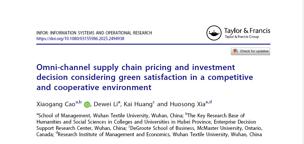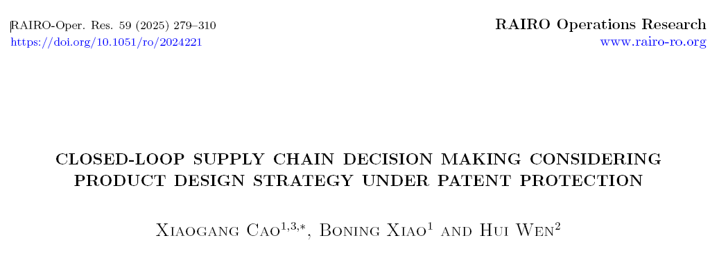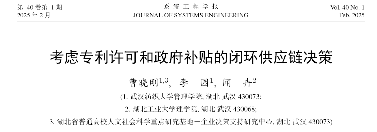 近日,国内管理科学与系统工程领域权威期刊《系统工程学报》和法国运筹学会会刊《RAIRO-Operations Research》以及加拿大运筹学会机关刊物《INFOR: Information Systems and Operational Research》分别发表了350vip浦京集团官网曹晓刚教授牵头撰写的论文《两级再制造下考虑专利许可和政府补贴的闭环供应链决策》和《Closed-loop supply chain decision-making considering product design strategy under patent protection》以及《Omni-channel supply chain pricing and investment decision considering green satisfaction in a competitive and cooperative environment》,350vip浦京集团官网硕士研究生李园、肖泊宁和李德伟分别为三篇论文的共同作者。