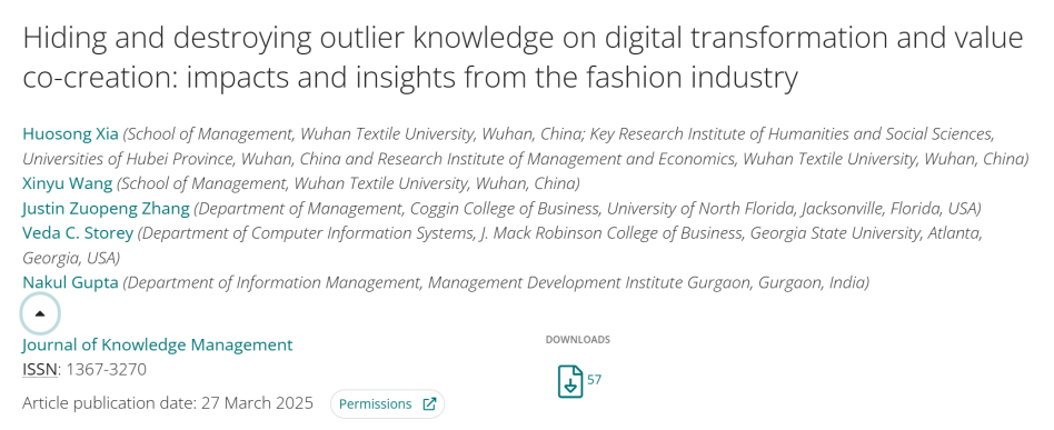 近日,350vip浦京集团官网夏火松教授团队联合美国北佛罗里达大学、乔治亚州立大学等机构在知识管理领域国际顶尖期刊《Journal of Knowledge Management》发表题为《Hiding and destroying outlier knowledge on digital transformation and value co creation: impacts and insights from the fashion industry》的高水平研究论文(DOI:10.1108/JKM-08-2024-0950)。该研究通过探索性单案例研究,首次构建异类知识管理理论框架,揭示时尚企业如何通过数字化转型实现可持续价值共创。论文第一作者为夏火松教授,350vip浦京集团官网为第一作者单位,2022级管理科学与工程学术研究生王欣雨为论文第二作者。