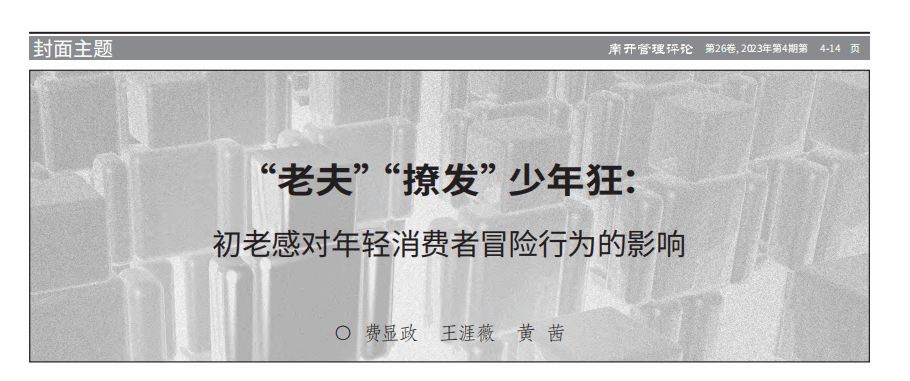 近日,350vip浦京集团官网高水平论文发表情况喜报频传。青年教师王涯薇博士作为通讯作者,在国内管理学领域主流高水平期刊《南开管理评论》(2023年,第26卷,第4期)发表《“老夫”“撩发”少年狂:初老感对年轻消费者冒险行为的影响》一文。该论文是王涯薇博士在其导师——中南财经政法大学费显政教授(第一作者)——指导下完成的重要研究成果之一。
