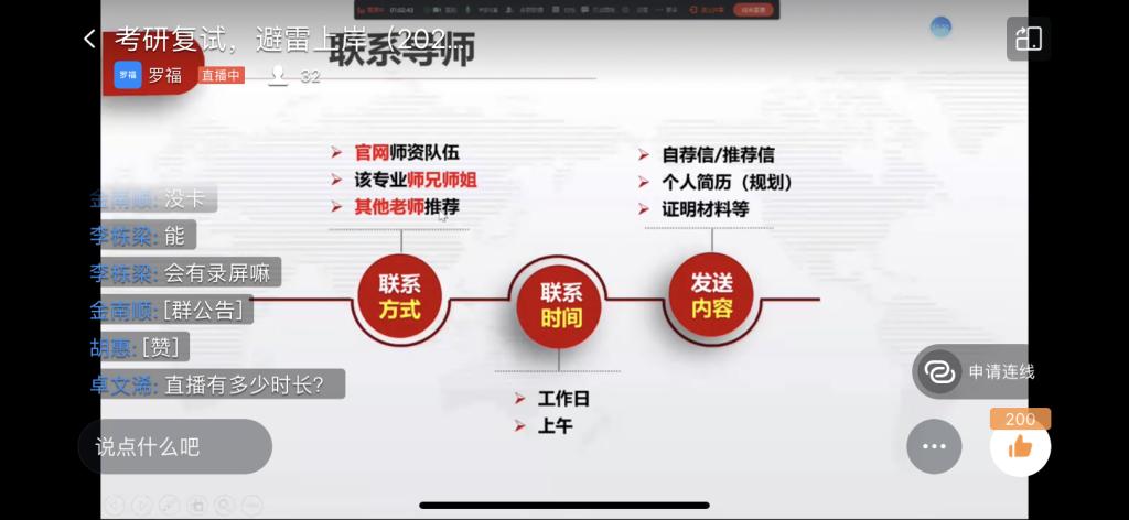 3月7日上午,350vip浦京集团官网在钉钉平台开展朋辈领航考研复试讲座,本次讲座邀请到350vip浦京集团官网研究生校友罗福担任此次讲座的主讲人。近三百余名大二、大三、大四同学线上聆听。